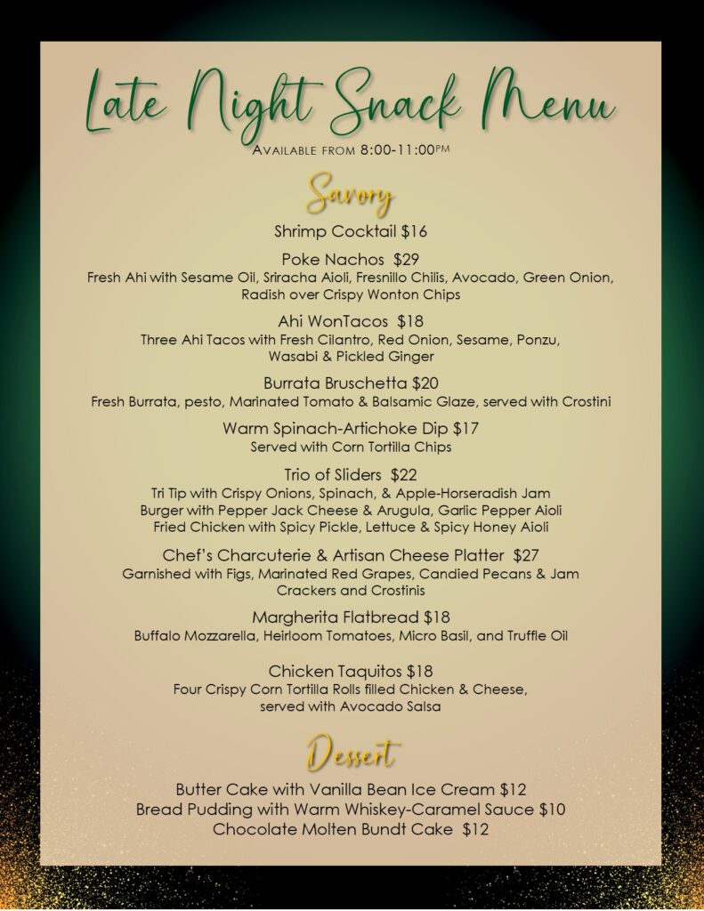 A la Carte Snack Menu until 10:30PM and Full Bar Service available for purchase.