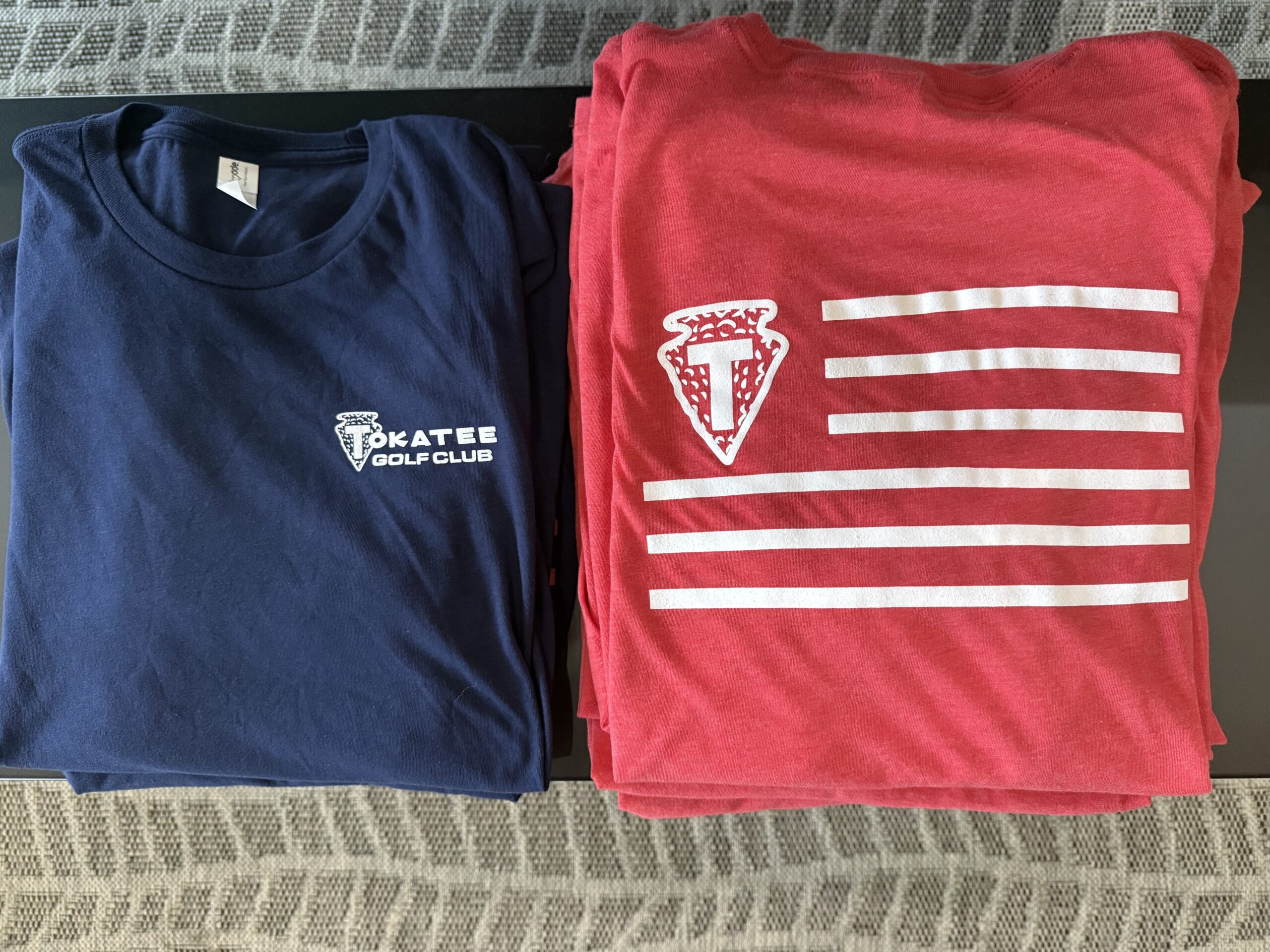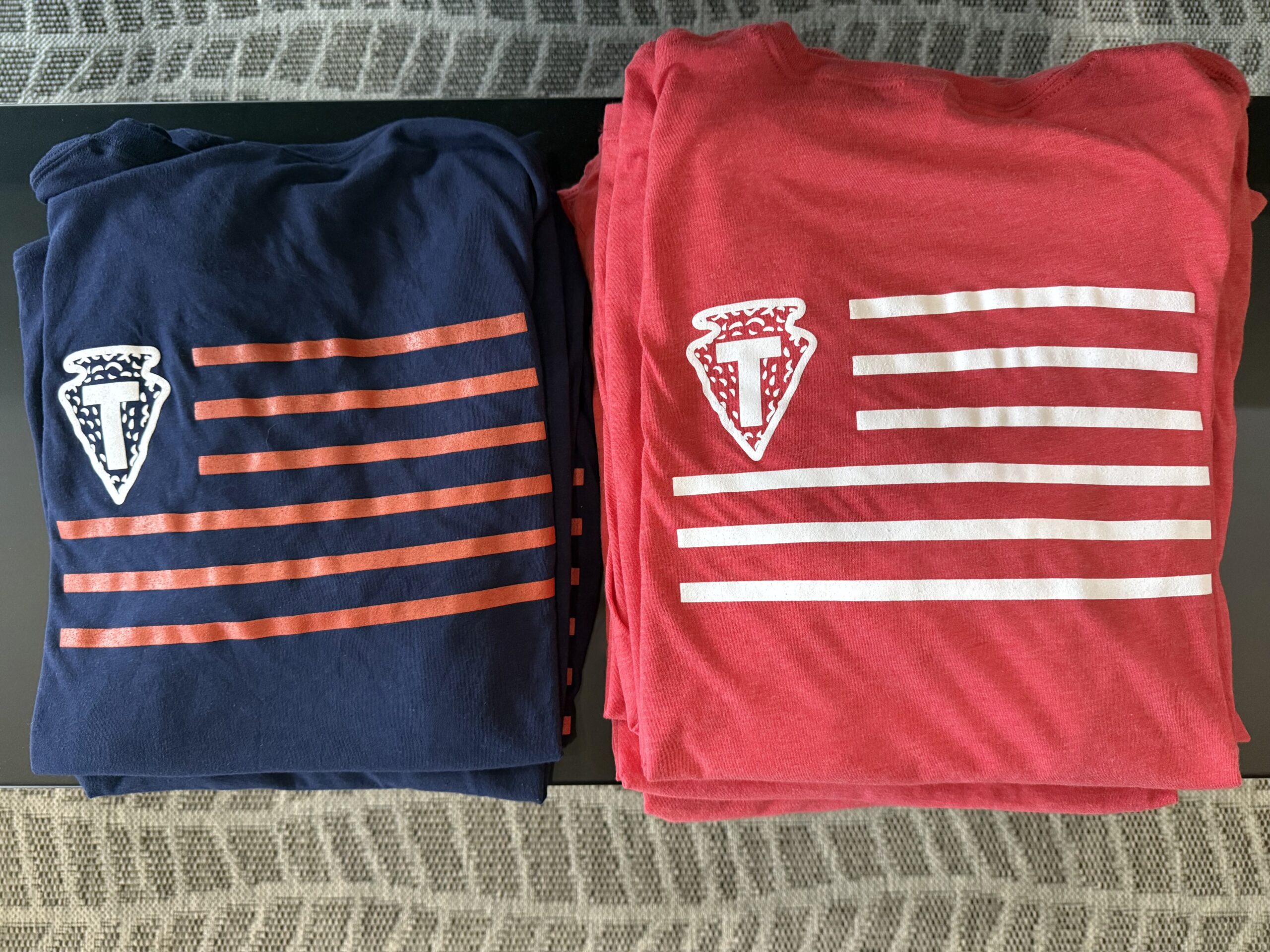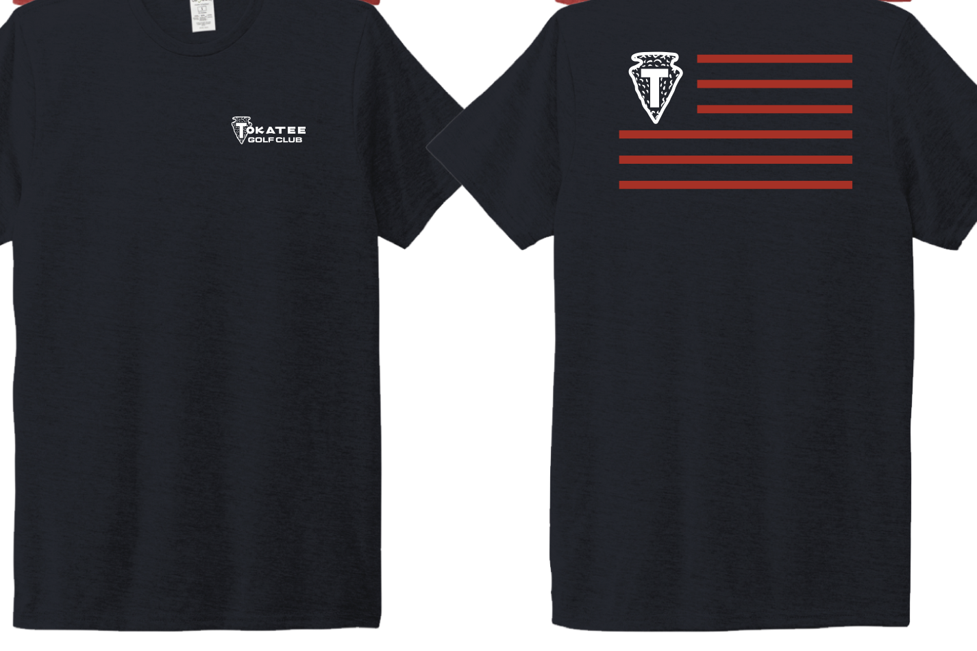 Cotton t-shirt with the Tokatee on the front and an American flag graphic on the back with the arrowhead S-XXL.
