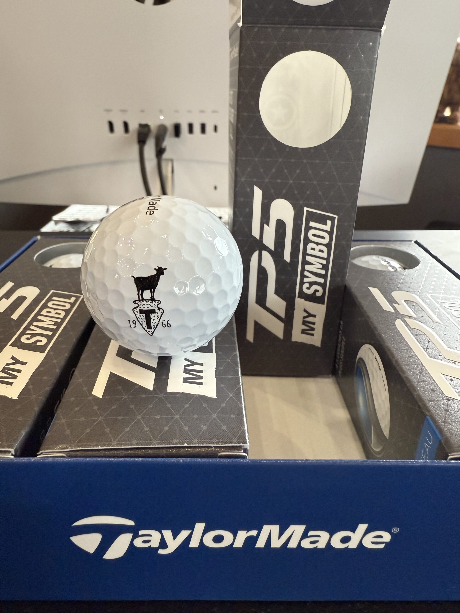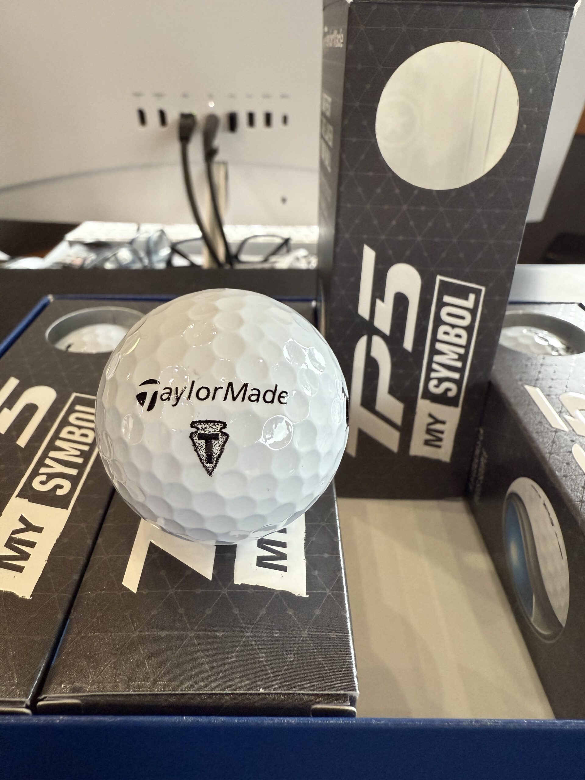 TaylorMade TP5 MySymbol dozen with the Tokatee arrowhead as the number and the Goat Logo on the side. 12 balls total.